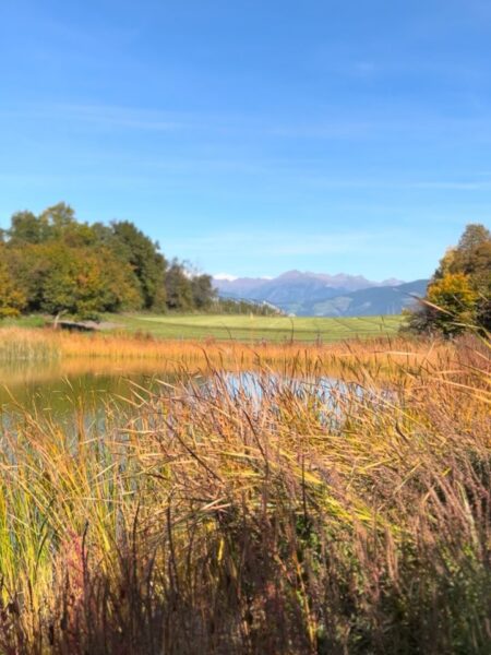 Ein kurzer, familienfreundlicher Spaziergang in Teis führt zur idyllischen Mesner Lacke – mit herrlichem Bergpanorama, Infostation zu den Gesteinen und einem tollen Spielplatz in der Nähe. Perfekt für Familien mit Kindern im Eisacktal, besonders im farbenfrohen Herbst.