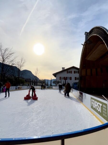 Eislaufen an der frischen Winterluft: Der offene Kunsteislaufplatz in Marling bei Meran ist das perfekte Winter-Ausflugsziel für Familien und Kinder in Südtirol.