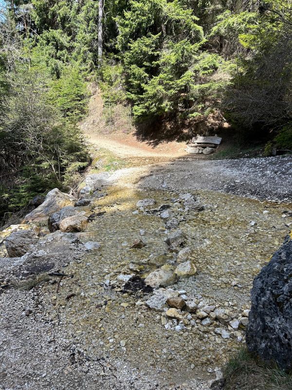 Von dort geht es über eine Wiese weiter Richtung Hofer Alpl – ab hier ist der Weg wieder besser ausgeschildert. Ihr folgt dem Waldweg, überquert unterwegs einen kleinen Bach (hier sind ein paar Sprünge über Steine gefragt) und biegt schließlich rechts auf den Weg 1A ab. Nach etwa 15 Minuten habt ihr euer Ziel erreicht.