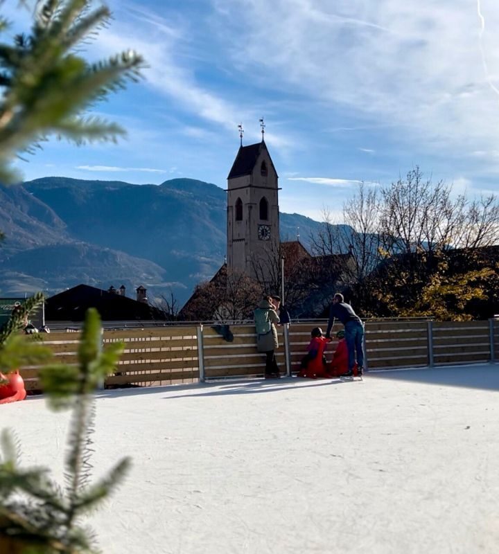 Pattinare all’aria fresca d’inverno: la pista di pattinaggio all’aperto a Marlengo, vicino a Merano in Alto Adige, è la meta invernale perfetta per famiglie e bambini.