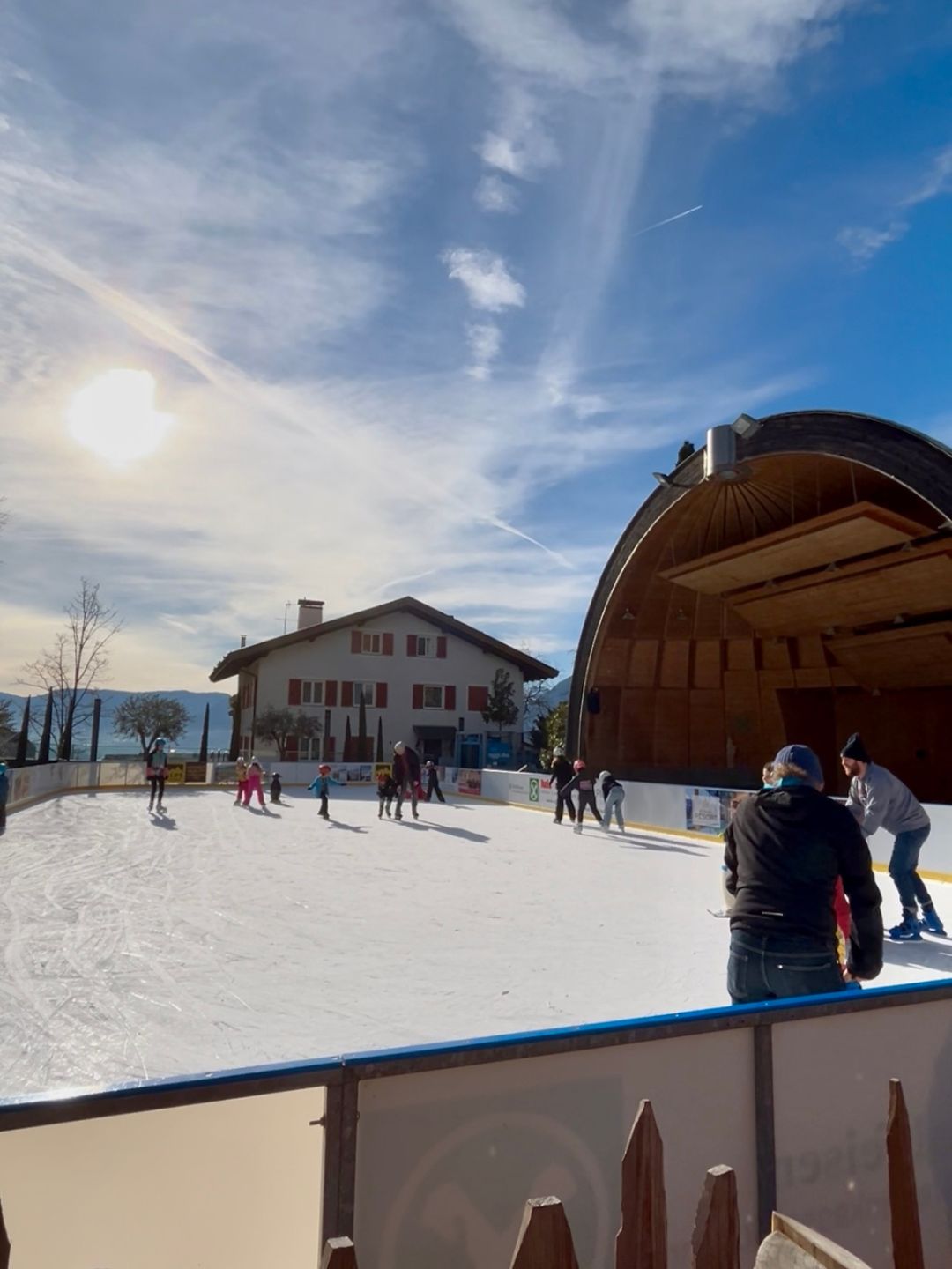 Sul posto è possibile noleggiare pattini e caschi in diverse misure. Attorno alla pista si trovano aree con posti a sedere per riscaldarsi e osservare il movimento. Un piccolo chiosco propone bevande calde come vin brulé, caffè e cioccolata calda, oltre a piccoli snack: perfetto per una pausa invernale.