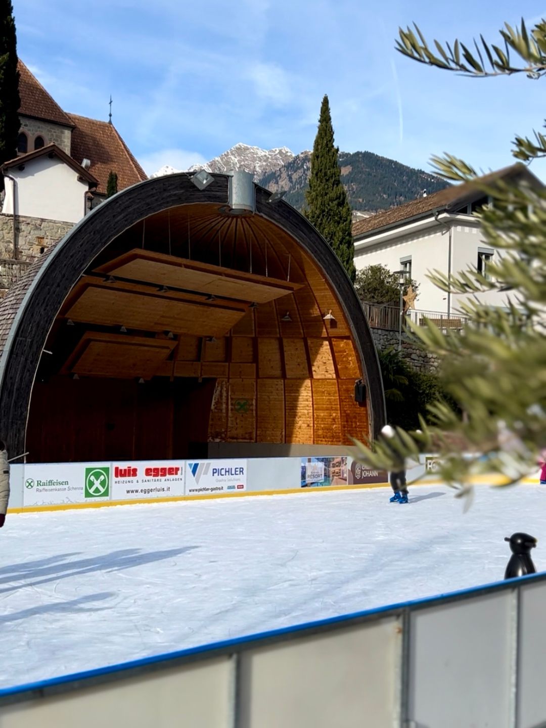 Divertimento invernale per famiglie e bambini nel cuore dell’Alto Adige: la pista di pattinaggio all’aperto di Scena offre un’atmosfera accogliente a pochi minuti da Merano.