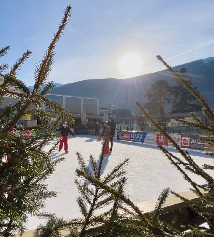 Eislaufen an der frischen Winterluft: Der offene Kunsteislaufplatz in Marling bei Meran ist das perfekte Winter-Ausflugsziel für Familien und Kinder in Südtirol.