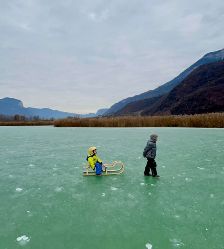 Obwohl der Kalterer See im Sommer als wärmster Badesee der Alpen gilt, kann es vorkommen, dass er im Winter gefriert. Und dann lässt es sich wunderbar auf dem türkisen See Eislaufen. Das Betreten des Eises erfolgt auf eigene Gefahr